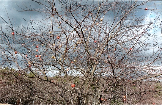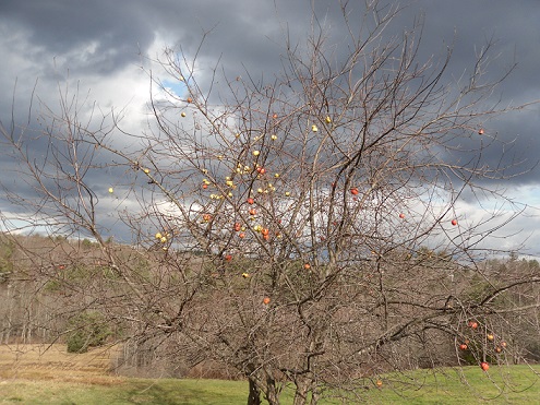 The beautiful fall leaves have gone and the fall skies have given way to the angry late fall/winter winds. The wild apple trees still show a few apples that the deer and turkeys will glean food from. The deer that are pictured in an earlier picture are for forging under a wild apple tree all left overs until covered with snow. They come often but only stay a short time.