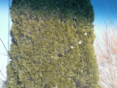 This Arborvitae Spire is at the southern corner of my garage and shelter to many bird. The white spots are birds facing south with the bush sheltering them from the North/ Northeast Maine Winds. The Mocking birds visit each year. They perfers the Blue Spruce branches.They have two nests in the Big Spruce.