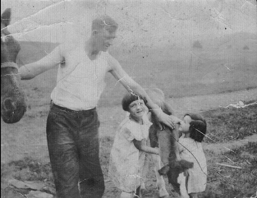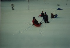 These are the Greatgrand children of Ernest/Jessie Kimball and grandchildren of Myra (Kimball)/Gerald Sparkowich. Sliding down a very large hill on a very cold day which makes for a very fast ride, getting faces full of snow. For the perspective of this hill; the picture shows about two thirds of the total hill. My home was built between two vertical hills. The daylight basement opens just above the top of the hill in the picture and the basement ceiling is just slightly below the top of the upper hill.
