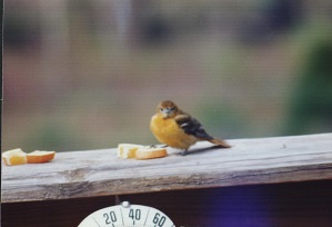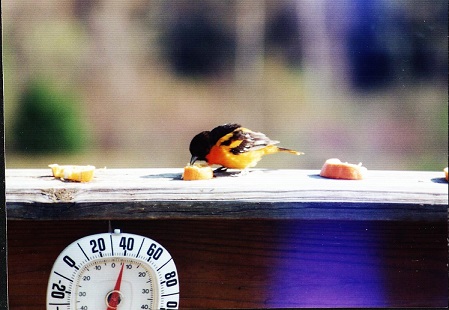 Baltimore Orioles are fun to watch at close range by providing them with with orange slices. These were formerly considered two species: the "Baltimore Oriole" in the east and "Bullock's Oriole" in the west. The male Baltimore Oriole has a black hood and upper back. Mr. and Mrs. 'O' have the same wing markings with much brighter coloring on the male.