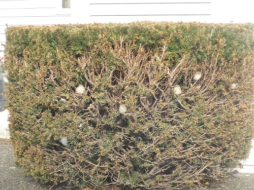 This bush is shelter for many Chipping Sparrows and other Sparrows. The white spots in this bush and the spire are just a few of the Sparrows. The holes are the quick hiding places, when the American Kestral Hawk or the neighbor's black cat shows up. If someone opens the house door, car drives in, birds hide.