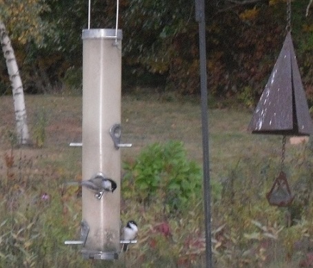 The Maine State Bird, Black-Cap Chickadee. All decked out with Black Cap and throat(bib), white cheeks, gray back,and dull white underparts. Wing heathers narrowly and indistinctly edged with white. They are very similar to the Carolina Chickadee, Mexican, Mountain. They are quick and hard to get a picture of. They are everywhere all year round; woodland and open land, suburban areas, birdfeeders in the winter. They call out they name withckick-a-dee-dee-dee and a second lower sound of fee-bee, fee-bee.