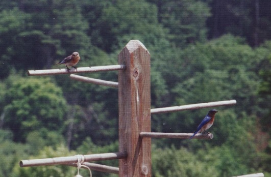 Eastern Bluebirds are different in that they are scarce and amazingly stunning. Males have chestnut throat, sides of neck, breast, sides and flanks; contrasting white belly, white undertail coverts. Male is uniformly deep blue above; female grayer. Other subspecies of bluebirds include; Southeastern Arizona, Western, Southwestern, Mountain. I have encouraged their nesting here with unique boxes and enough boxes for other birds.