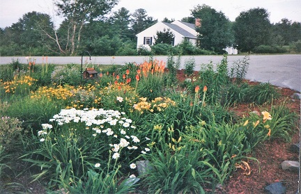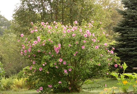 Below is a Rose of Sharon bush. I have several, that was give to me by my niece Sharon Z. of Webster, NY., daughter of Ernest R.and Joan Kimball and (granddaughter) of Ernest and Jessie Kimball. Looking from my driveway over the culdesac, to a house that is on the site of our former ski house.