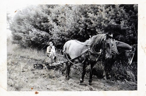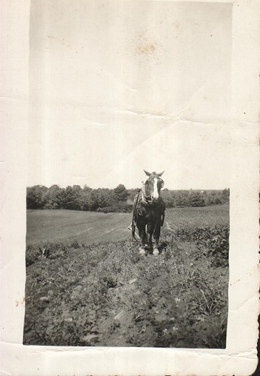 We had another horse named Bob. Bob, was a big black work horse, who was so slow and moderate, that kids could climb on, ride without a bridle, using just the halter. Dad knew that like Dan, that Bob would never kick. Then Dad bought another horse and Bob was used as a single, by us kids, on the hay rake. A little girl that came to Maine and stayed with our neighbor. The little girl would sit and ride on the footboard of the single horse rake near my foot pedals, with me and BOB.