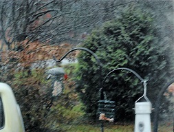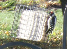Both of these pictures are of the Downy Woodpecker. The white back generally identifies both Hairy and the similar Downy Woodpeckers. The Downy is about 6" long. The Hairy is larger at about 9-1/4" long, with a longer bill. The outer tail feathers are entirely white. I generally can only tell by the height or width of the suet cage. This cage is 7-1/2" high. The Downy calls include a loud, dull-sounding pik, and also a descending rattle. The Hairy call is a sharp distinctive peek, and is louder than the Downy.