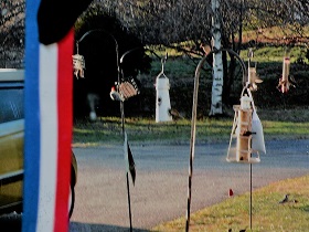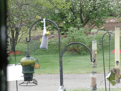 These are male Gold Finch, except for the female on top of the hanger crook. These birds are bright yellow with black cap; black wings show white bars, yellow shoulder patch, uppertail and undertail coverts white; tail black-and-white. A little side note: I have been privileged to watch this bird play on the edge of the lawn where it meets the tall unmowed grass. They would light on a tall spear of grass which would bend. They would flutter their wings to straight the spear. Then stop so it would bend again. They flutter their wings again. They would do this over and over, for quite some time.