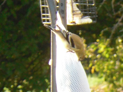 and Female Hairy's have a head that looks somewhat flatter on the crown. Hairy Woodpeckers are much longer at about 9" long. This picture was taken from kitchen window.