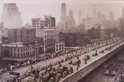 With the 1939 skyline of New York as a backdrop, the King and Queen are shown (first car) as they proceeded up the Westside highway along the Hudson, enroute to the New York World's Fair, soon after they landed at "The Battery", the June 10, while thousands of New York residents cheered.