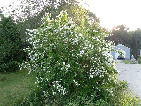 Below is a Variegated Weigela and Arborvitae Spires. These are close when the hawk appears. The Mock Orange on the right was transplanted from the farm house. My husband gives it a hair cut which I fuss about but it really is was to close to the driveway.