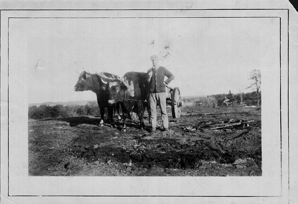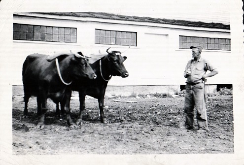 The above oxen photo on the left is of Ernest somewhere about 1921 after Ernest and brother George purchased the farm in Kennebunk. The photo on the right is of Ernest somewhere about 1958/60 with a young pair of oxen. Note: The stance is almost indentical.