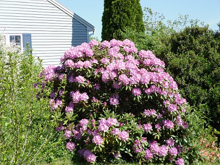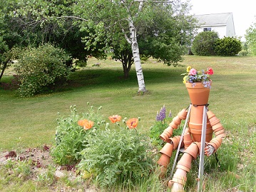 The photo below is my pot lady. Like myself she is getting old and now she needs crutches this year. I saw this in the "Birds and Blooms" magazine and copied the idea. The Rhododendron is one of two as well as the Holly Bush next to it that have gotten out of control.