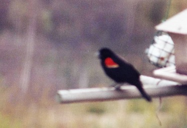 Redwing Black Birds-- Adult males have dark red shoulder patches tipped with buff-yellow. Sometimes the dark red shoulder patches are not visible when perched, only the buff-yellow. They are visible when in flight. The females are very dark brown above with some much lighter streaking around the neck area. They only visit Maine in the summer. They are rare in Maine. Their song is a liquid, gurgling konnk-la-reee, ending in a trill. The most common call is a chacknote. Their range is from Alaska and Southern Newfoundland South to Florida, the Gulf Coast and Central Mexico. Winters regularly north to Pennsylvania and British Columbia.