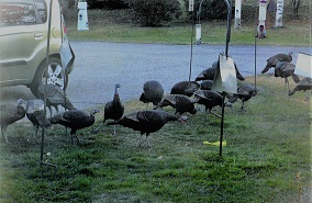 The picture of the deer was taken from my living room window, on the first day of hunting season. Myra's husband had left our area to go hunting elsewhere. I could not resist taking this picture. The turkeys are hard to keep from the lawn. I use two blocks of wood and bang them together. The red squirrel is a stranger that appeared this year and now for the best story of all is the Moose.