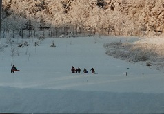 Skis in the 40's consisted of narrow boards with turned up ends and tow straps to slide the boots into. Dad made our skis by steaming the toe part of the thin Oak wood strip, over the steaming water of milk bottle washing tubs and bending them around the fence posts of the cow yard, and securing the boards in that position until cured. My Dad, also built our 8 ft toboggan by this steaming method. Once cured into a curve, it was secured with rawhide straps. Our boots were either work boots of leather or rubbers over our shoes. My Mom would put plastic from plastic grain bag over my socks to keep them dry, if snow went inside, which it often did, we had a small cabin (formerly a soap making house) which had moved over to the hill and Dad poured a cement floor and built benches so we could warm our feet in the large Fieldstone fireplace. This fireplace was one of two built by a neighbor who was a master mason. The other fireplace was on a little knoll near a large skating pond that Dad made by damming up a tiny brook that ran through a low area at the bottom of the hill, shielded from skiers by a tree area.